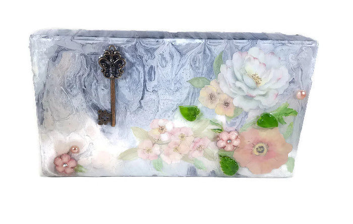 Romantic Garden Mixed Media Wall Art Posted by Leigh on November 30, 2017February 4, 2018 Blush pink and gray mixed media collage with brass key and a thick coat of glossy resin.
