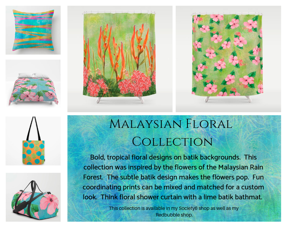 Here is the Malaysian Floral Collection. This was inspired by the tropical flowers of the Rain Forest. The backgrounds have a subtle batik appearance to give the textiles interest and texture. The hibiscus blossoms and other tropical flowers add some warm colors for an island feel.
