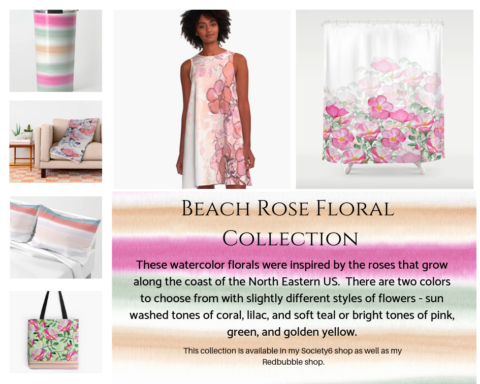 This collection just brings me such joy – memories of summers spent on Boston’s North (and South) shore, the bright colors of a garden in bloom, and the sun washed shades of beach houses. This collection is fashion as well as home decor, and you can check it out at my Society6 shop and my Redbubble shop.